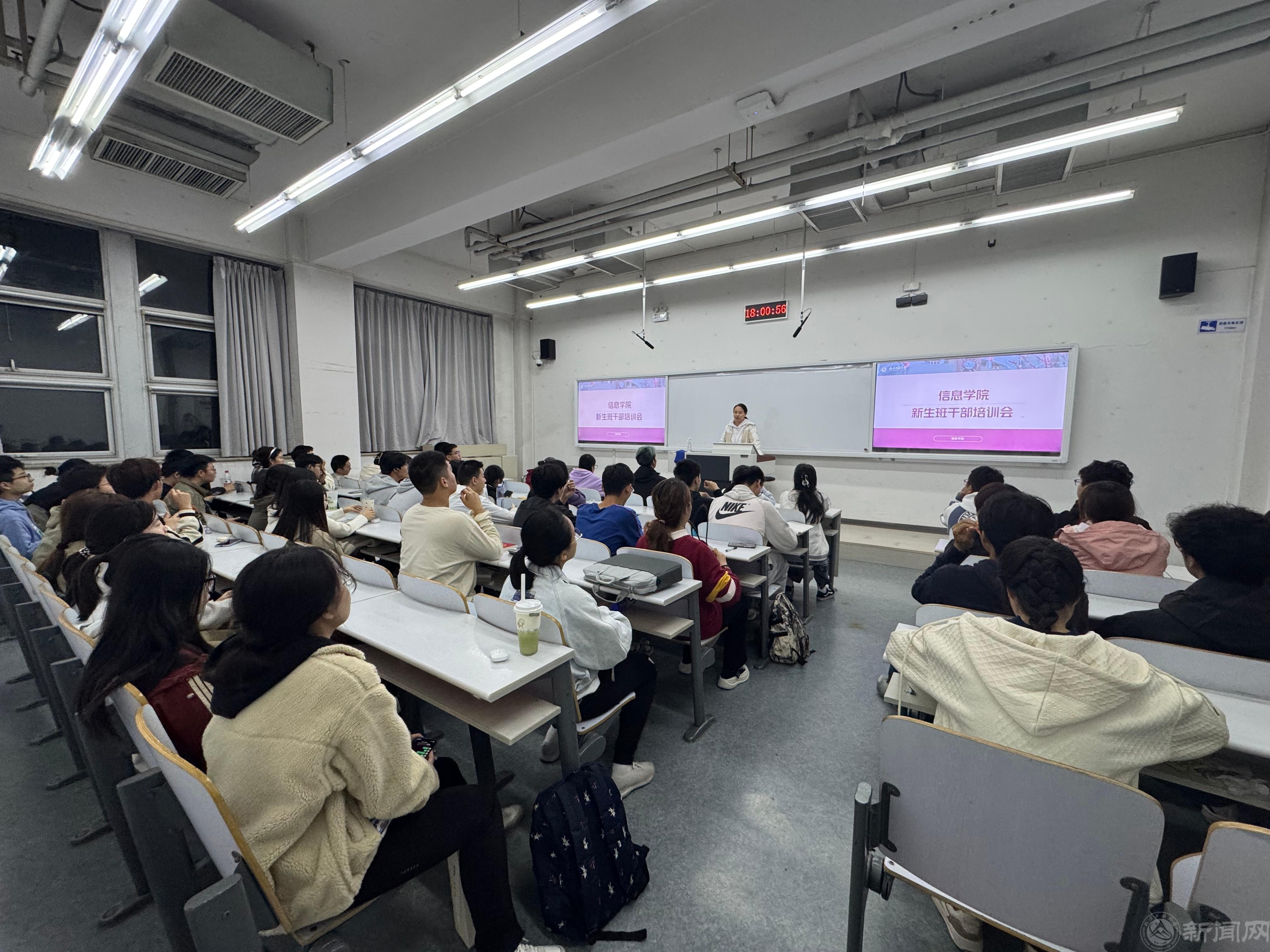 为进一步加强2024级新生班级管理,提升新生班委的综合素质和服务管理能力,帮助班委明确班级工作定位和工作职责,信息学院于10月16日在瀚学203教室开展2024级班委培训会,全体新生班委参加,活动由辅导员王鑫淼、陈煦婷主持。