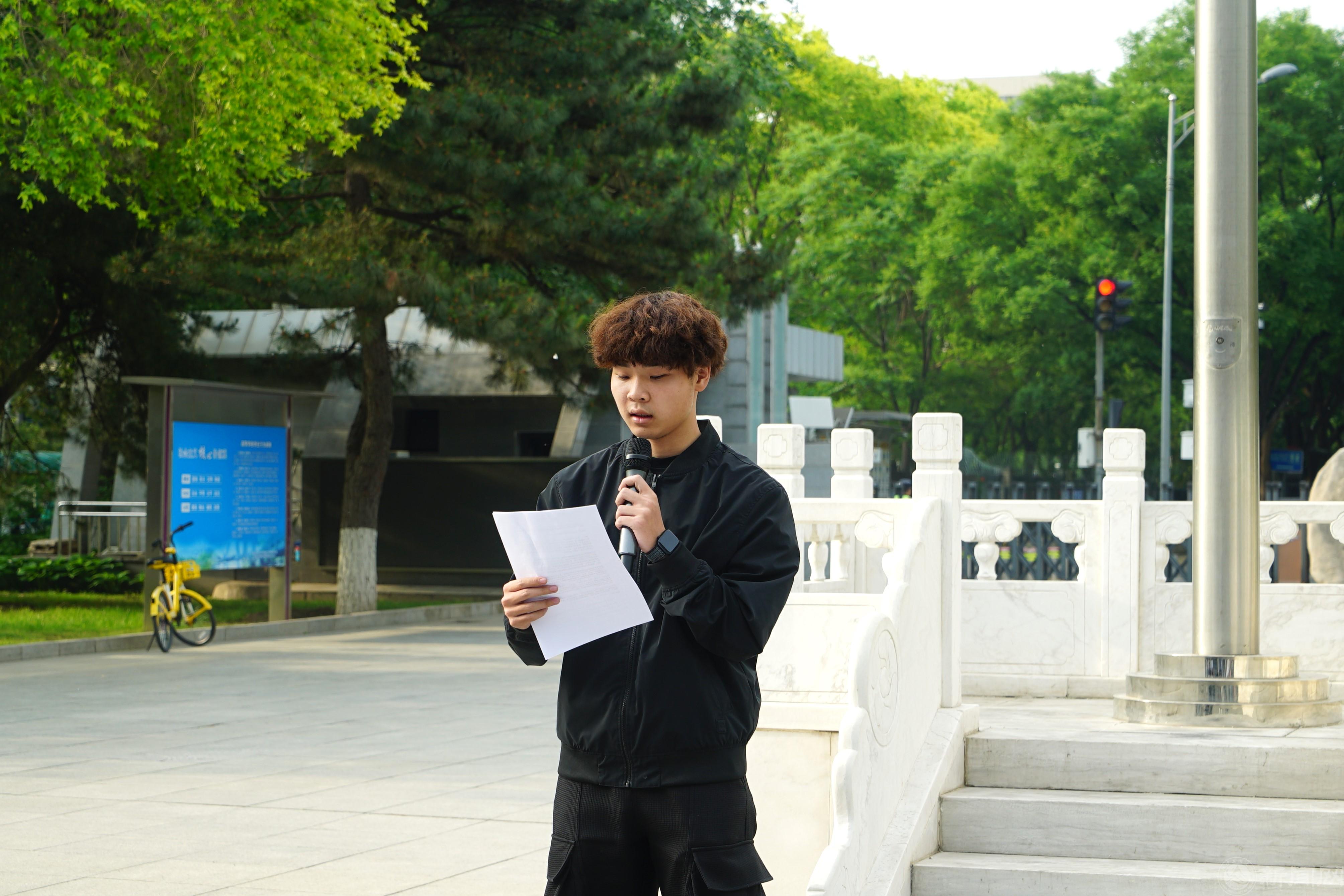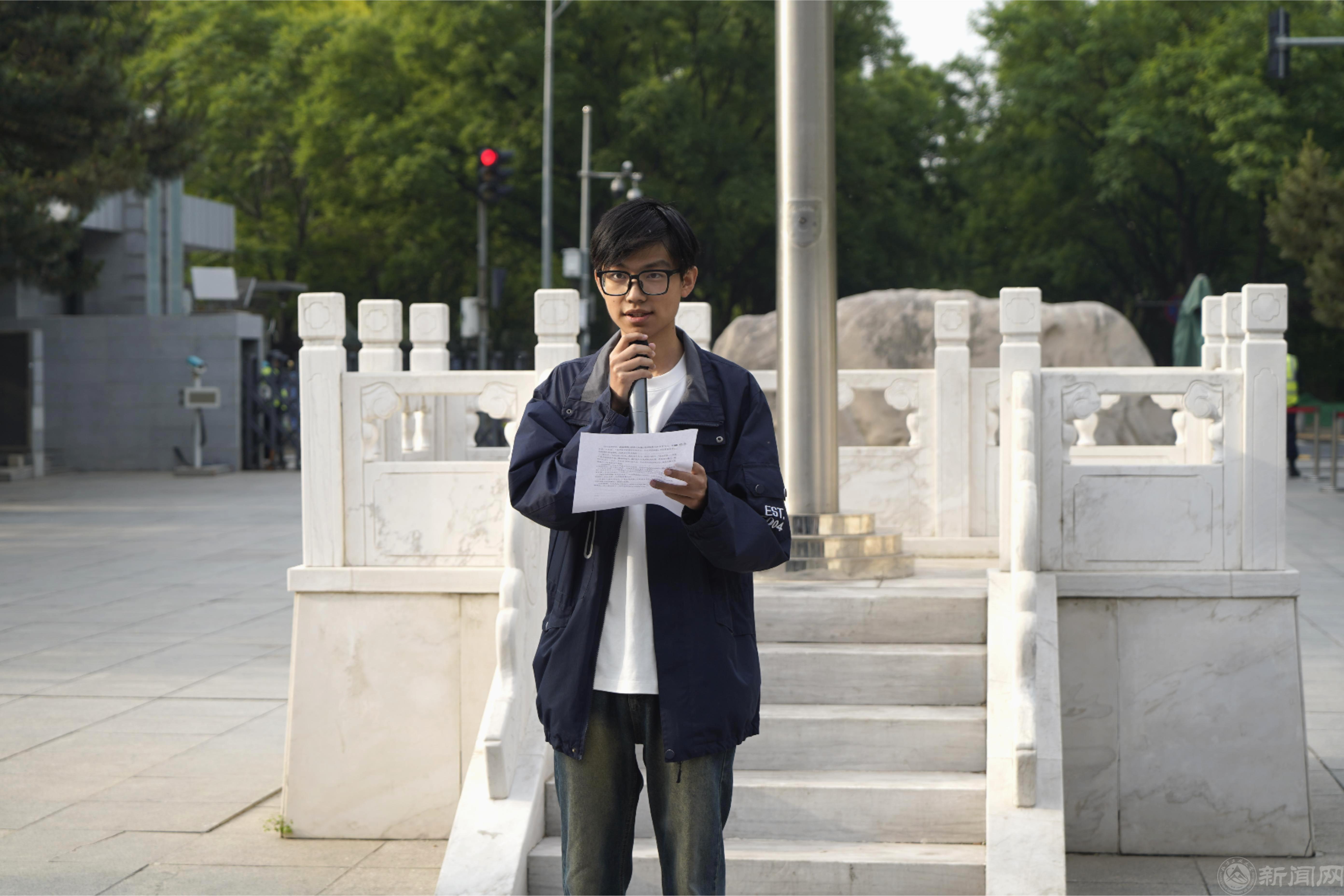 统24-1班王张之御同学和统23-1班王英行同学在国旗下发言。王张之御同学将五四精神与体育精神相结合,呼吁同学们用追求卓越、永不言弃的精神投身强国建设,书写不负自我不负国家的青春华章。王英行同学则以五四精神为引,结合现实困境,号召同学们保持独立思考与热爱,坚持践行五四精神,在磨砺中坚守信念,铸就坚毅务实的青春品格。