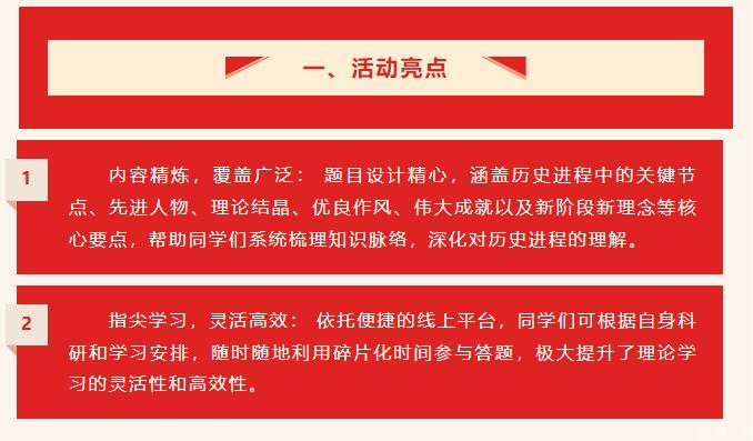 本次党史知识竞赛旨在引导大家深入学习党史、领悟党的精神,激发爱党爱国热情,筑牢理想信念根基。采取线上答题的形式,题目设计严谨,类型丰富,涵盖了单选、多选两种题型,涵盖党史重大事件、重要人物、理论成果、光荣传统、伟大成就以及习近平新时代中国特色社会主义思想等核心内容。
