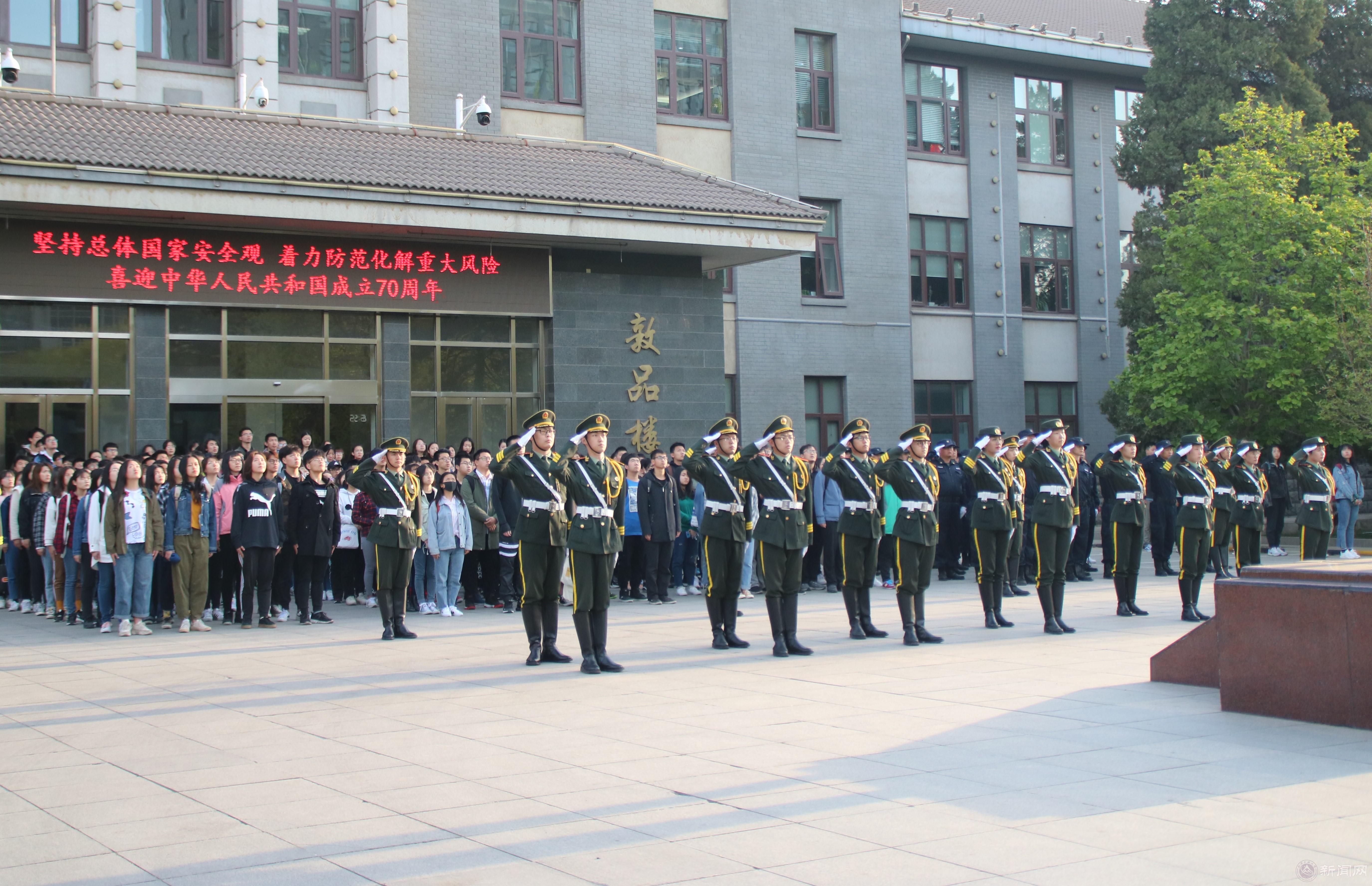 4月15日清晨,理学院在敦品楼前举行了隆重的升旗仪式。校安稳处处长仝西川、学院院党委副书记李冱岸、学院全体辅导员、校安稳处校警队、校国旗班预备队、理学院18级全体同学、理学院部分学生会干部、团委学生干部参加了本次升旗仪式。