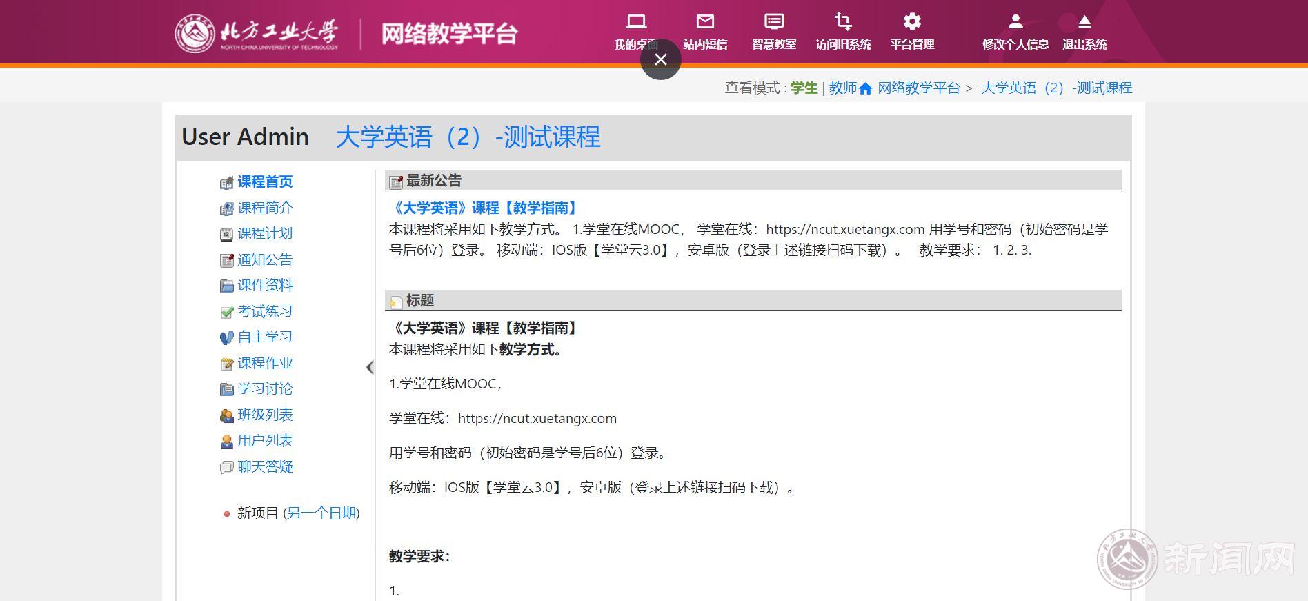 提前将春季学期课程信息导入多模式教学网,并提前开放外网直接访问,网址为http://iclass.ncut.edu.cn/iclass/。学校多模式教学平台作为延期开学期间学校教学的摘要管理平台,所有课程在学校多模式教学平台输入课程基本要素,也建议老师尽可能利用多模式教学平台课件、作业、考试等功能开展教学工作。
