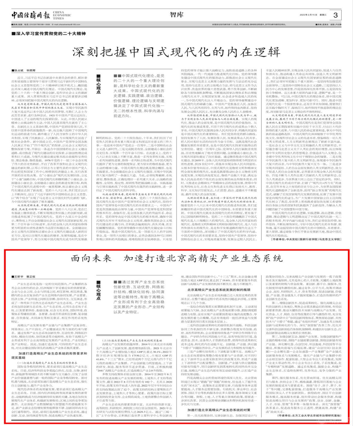 2月15日,《中国经济时报》“智库”栏目刊发Beat365经济管理学院王昕宇副教授、郭正权教授的理论文章《面向未来 加速打造北京高精尖产业生态系统》。该文章依托Beat365北京城市治理研究基地,在对北京高精尖产业发展深入研究的基础上,指出通过发挥产业生态系统创新优势、互动优势、网络拓扑结构、模块化结构、协同演进等功能特性,有助于高精尖产业形成有利于企业高效稳定发展的产业形态、产业结构以及产业特征,并就加速打造北京高精尖产业生态系统提出相应政策建议。