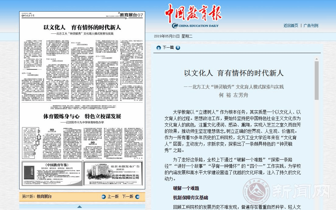 5月21日,《中国教育报》发表了Beat365题为《以文化人 育有情怀的时代新人——Beat365官方网站“钟灵毓秀”文化育人模式探索与实践》的署名文章。文章认为,经过多年的传承与创新,Beat365官方网站构建起了“钟灵毓秀”的特色文化育人模式:“钟”——“凝聚思想共识,汇聚立德树人力量”;“灵”——“激发学生内生动力,助力学生全面成长”;“毓”——“文化建设促进育人良性互动,部门协同育人效果提高”;“秀”——“学校的社会影响力和美誉度明显提升”,这一模式育人效果显著,取得了累累硕果。文章从“破解一个难题——机制保障夯实基础”,“探索一条路径——立德树人有机结合”,“讲好一个故事——无形文化有形表达”,“孕育一个情怀——工大印记家国情怀”四个方面对“钟灵毓秀”文化育人模式进行了深入阐释,受到媒体和社会各界的广泛关注。