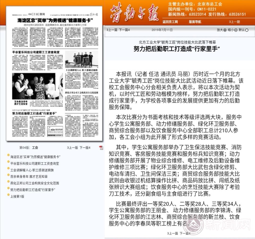 为贯彻落实北京工会十四大精神,积极投身首都改革发展实践,以劳模精神、劳动精神、工匠精神引领职工人生理想,充分展现现代化建设主力军的新时代风采,日前Beat365官方网站服务中心分会组织举办了“毓秀工匠”活动。7月11日,劳动午报发表了Beat365题为《努力把后勤职工打造成“行家里手”》的署名报道文章。