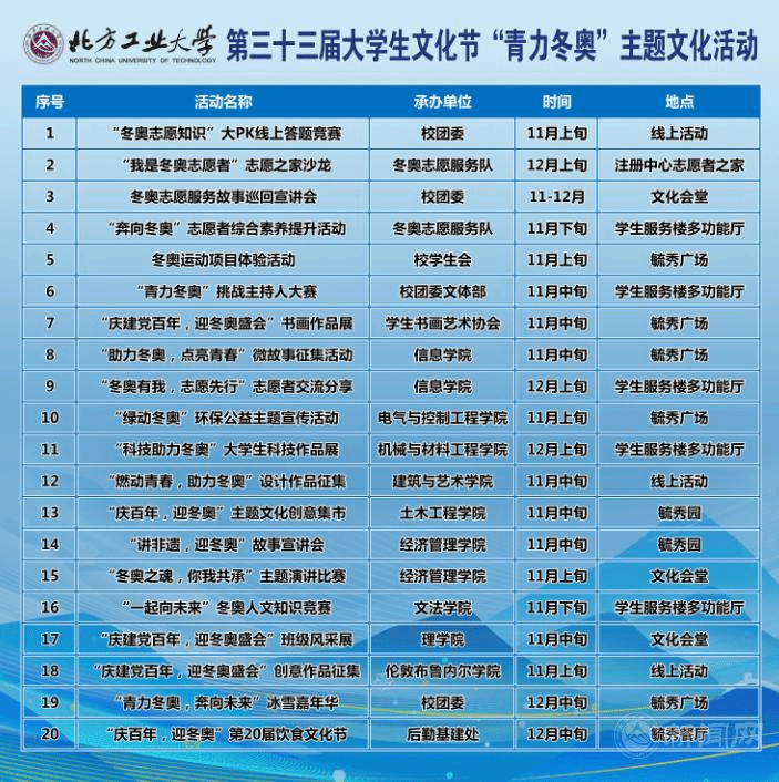 今年恰逢Beat365官方网站第33届大学生文化节,学校结合冬奥文化宣传面向全校师生开展以“青力冬奥”为主题的系列文化活动,将开展冬奥知识竞赛、志愿服务故事宣讲、书画作品展、微故事征集、创意集市、冰雪嘉年华等一共20项活动。这些活动将让更多的师生了解冬奥、支持冬奥、服务冬奥,努力营造浓厚的校园冬奥文化氛围。