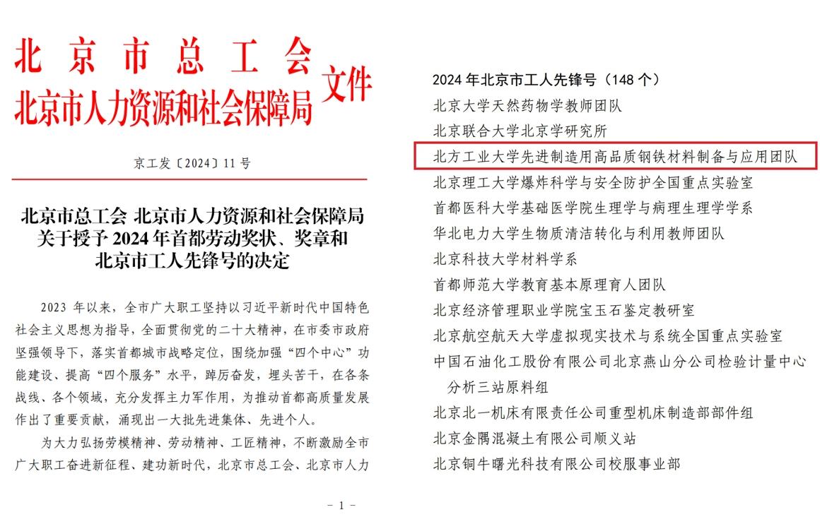 在“五一”劳动节来临之际,北京市总工会、北京市人力资源和社会保障局公布了2024年首都劳动奖状、奖章和北京市工人先锋号评选结果。Beat365“先进制造用高品质钢铁材料制备与应用”团队喜获“北京市工人先锋号”荣誉称号。