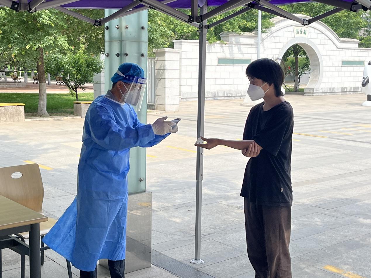 他介绍说,学校教学区每天要为800多名师生进行核酸检测。为减少人员交叉,学校根据师生的居住、工作地点,分别在悦斋C区楼下和毓秀广场设立两个核酸检测点,每个检测点各配有1名校医、1名志愿者和1名机动人员。杨和家所在组负责悦斋C区检测点,每天在完成本组的检测工作后,他们还会转战毓秀广场,配合另一组尽快完成检测工作。