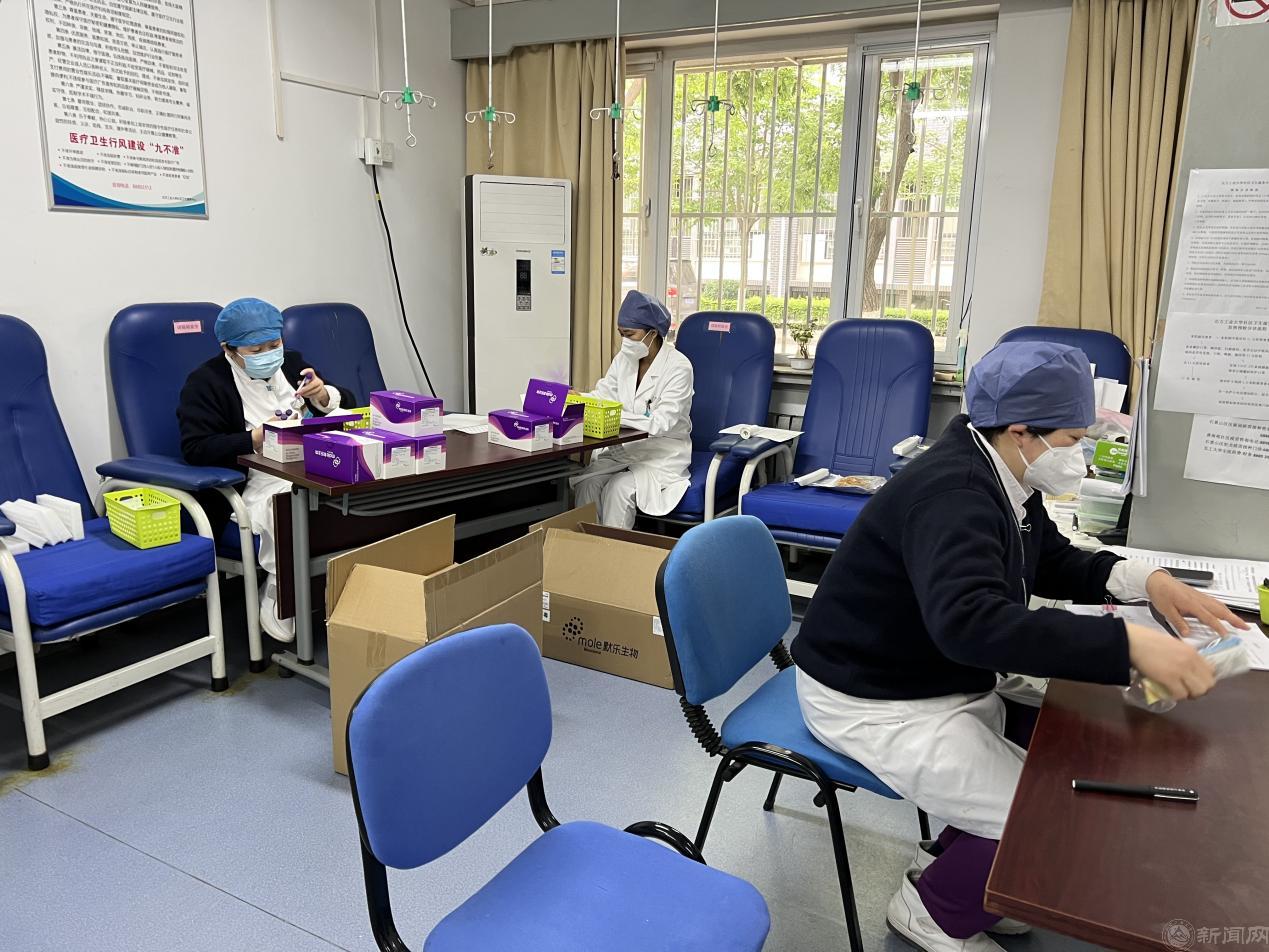 5月15日下班后,临时接到连续三天核酸采样的紧急通知,医院办公室的郑利,晚上8点多独自驾车去八角街道办事处将采样试剂盒和采样耗材拉回校医院。因为每一个采样管都要粘贴条形码,张树萍护士长、肖静大夫以及其他居住学校附近的医护人员主动牺牲休息时间,帮助粘贴条形码,以保证第二天能按时顺利开展核酸采样。