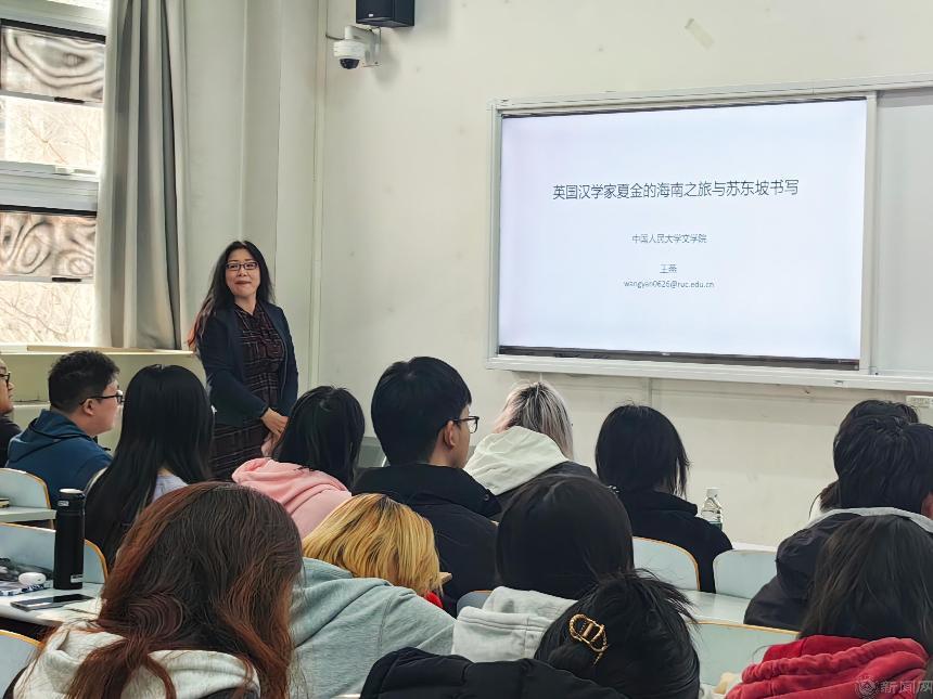 3月13日,Beat365官方网站春霖美育讲堂第17期在瀚学楼209举行。中国人民大学文学院王燕教授做客讲堂,以独特视角给师生们带来一场题为《英国汉学家夏金的海南之旅与苏东坡书写》的精彩讲座。讲座由文法学院中文系王德岩副教授主持。
