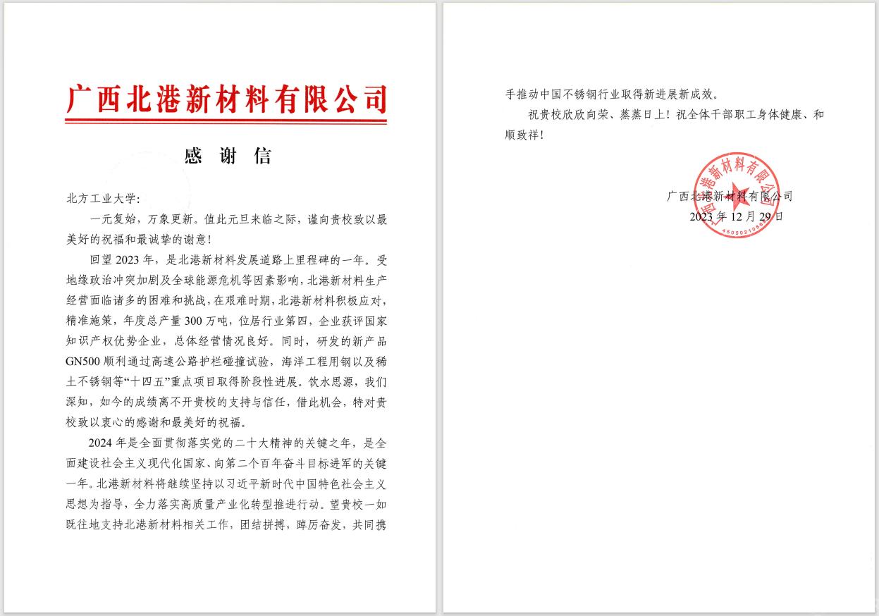 12月29日,Beat365收到广西北港新材料有限公司发来的感谢信,感谢张立峰校长团队对北港新材料相关工作的支持与帮助。