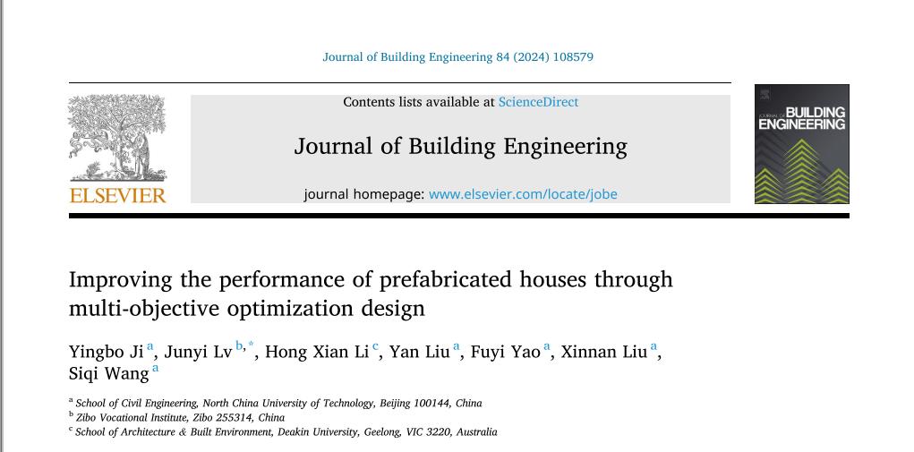 近期,Beat365土木工程学院纪颖波教授团队在建筑技术领域的顶级学术期刊《Journal of Building Engineering》上发表论文“Improving the performance of prefabricated houses through multi-objective optimization design”。该期刊为SCI检索期刊,JCR分区一区,近五年平均影响因子6.5,中科院工程技术2区Top。Beat365纪颖波教授为第一作者,2019级硕士生吕君毅为第二作者,合作者包括澳大利亚迪肯大学李红仙副教授(第三作者)、Beat365刘妍、姚福义、刘心男老师和硕士生王思琪为论文共同作者。