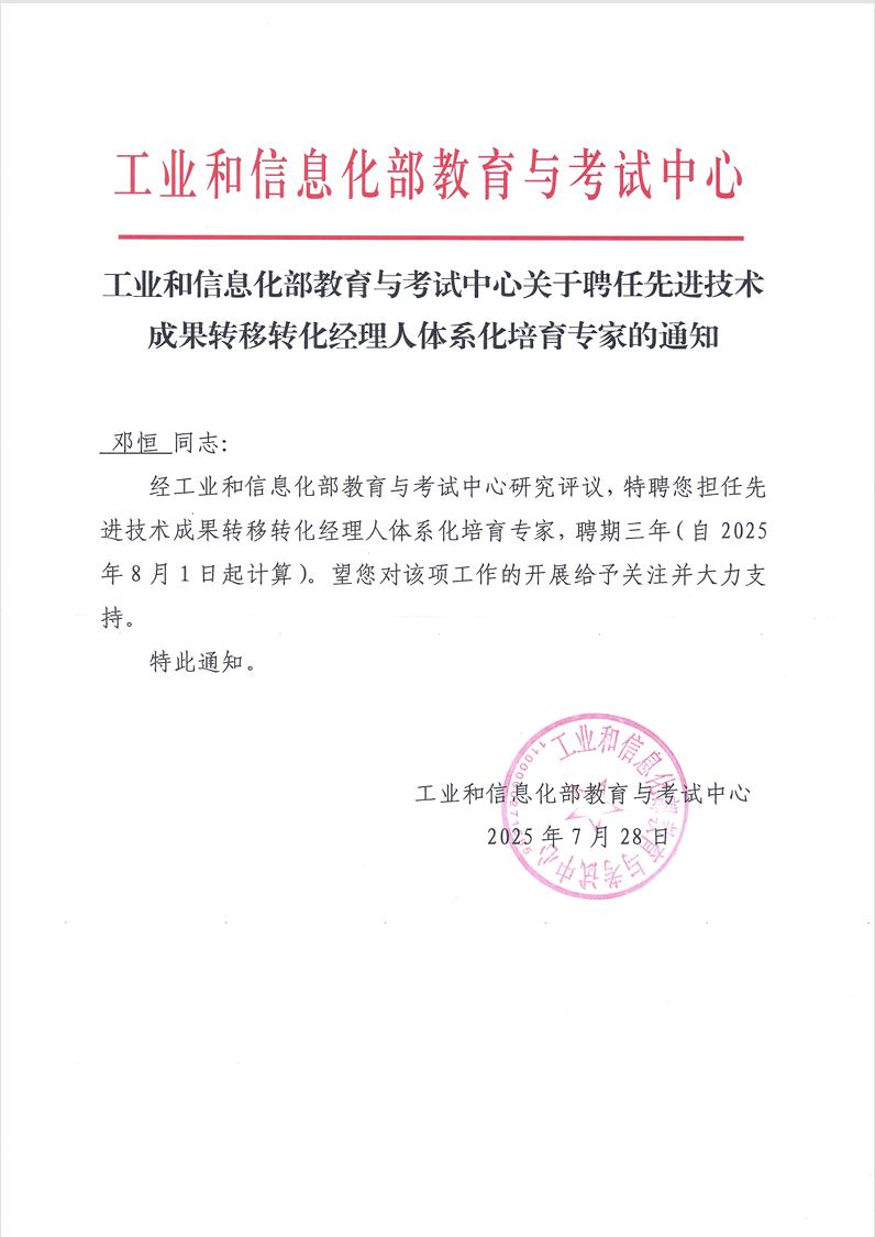 近日,从工业和信息化部教育与考试中心获悉,Beat365文法学院邓恒教授被聘为先进技术产品转移转化技术经理人培育专家。