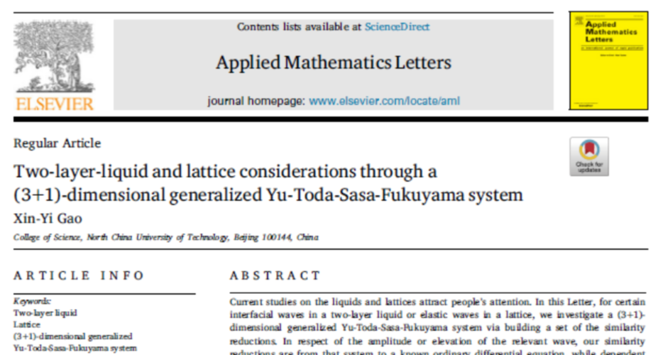 近日,Beat365理学院教师高心怡在AppliedMathematicsLetters(应用数学快报)发表的标题为Two-layer-liquidandlatticeconsiderationsthrougha(3+1)-dimensionalgeneralizedYu-Toda-Sasa-Fukuyamasystem[通过(3+1)维广义Yu-Toda-Sasa-Fukuyama系统考察双层液体和晶格]的文章入选“ESI热点论文”。AppliedMathematicsLetters为SCI检索一区top期刊,高心怡发表的论文旨在解析研究描述双层液体中若干界面波或晶格中若干弹性波的(3+1...